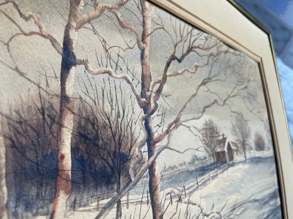 It’s not perfect. It’s still more yellow than I’m sure my grandma intended it to be, because I have other snowscapes of hers, and they all tend toward bluish undertones with little to no yellow. But it is an improvement. And, most importantly, I’m a little more confident I can get rid of *most* of the smoke smell, so it’s tolerable to keep in my house.